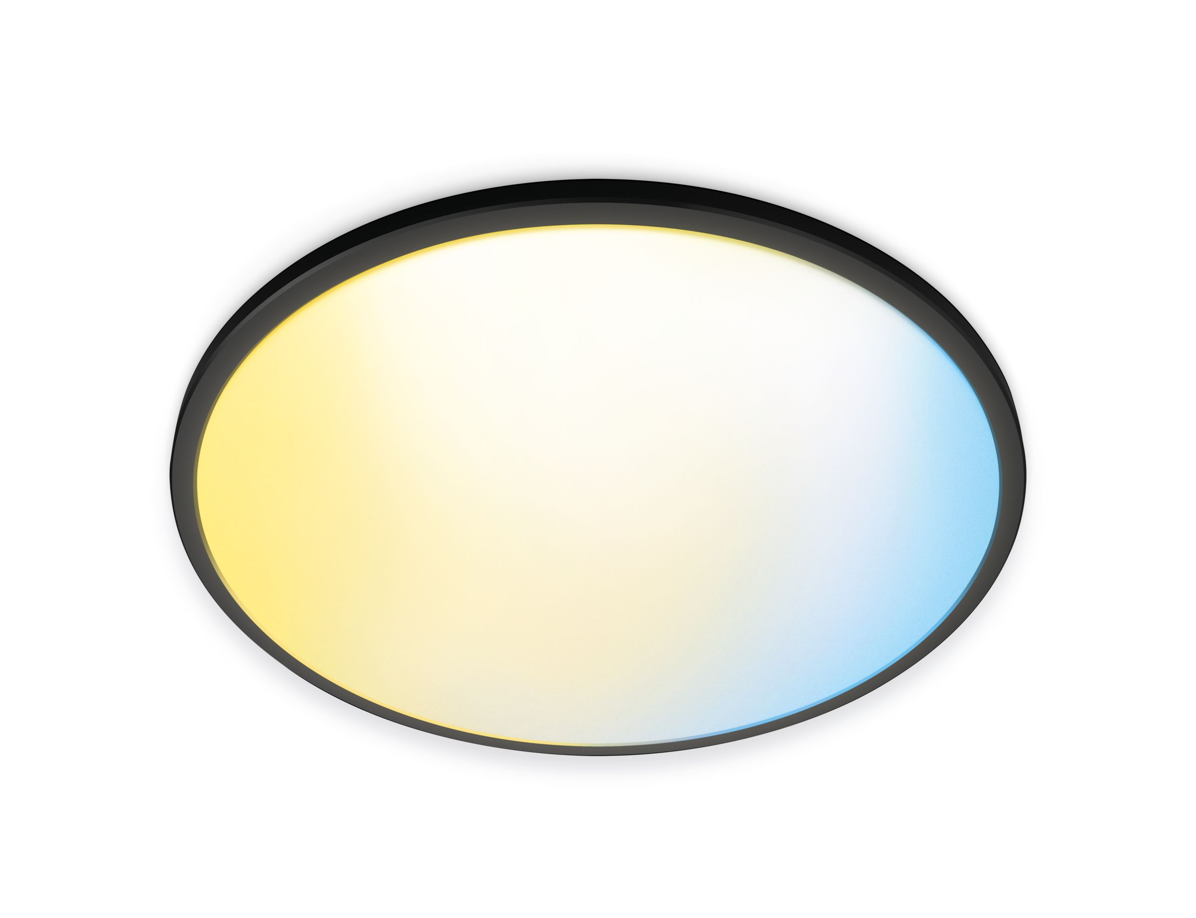 La plafoniera WiZ Super Slim ti consente di avere facilmente una luce che si adatta alla tua vita quotidiana. La sua grande superficie luminosa circolare inonda la tua stanza di una fredda luce blu che favorisce l'attenzione e la concentrazione e si attenua in un colore morbido e caldo che ti aiuta a rilassarti.